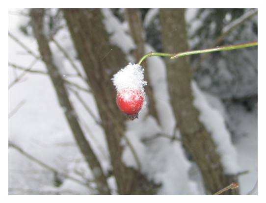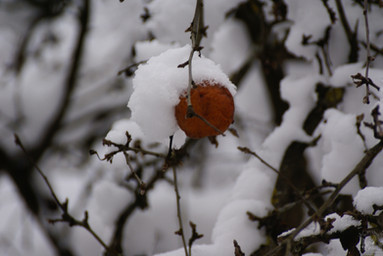 Wow, I want this to be bigger SO BAD! I love this. Is that a lone apple? Or a tenacious leaf? I'm going with apple. It's lovely, like a jewel in a crown of winter, with lovely lines of snow and such a nice deep brown of the branches.