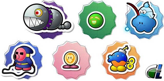 1-up Mushroom, Power-up Mushroom, Bob-om, Bob-om Buddy, Koopa Troopa, Goomba, Boo, Chomp/Chain Chomp, Shy Guy, and Yoshi from the Mario series of games~You can purchase these as buttons! Please check the link below for more details: