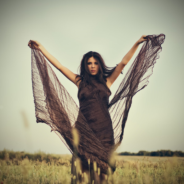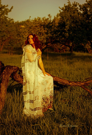 its lovely and well shoot. I like the warm tones in the background which changes a forest which is normally cool into a warm backdrop. I also love the drapping of the garmet. I am not sure about the having the subject dead center though. Maybe off to on side or another could strength the visual tension better than dead center. Overall lovely and nice narrative.