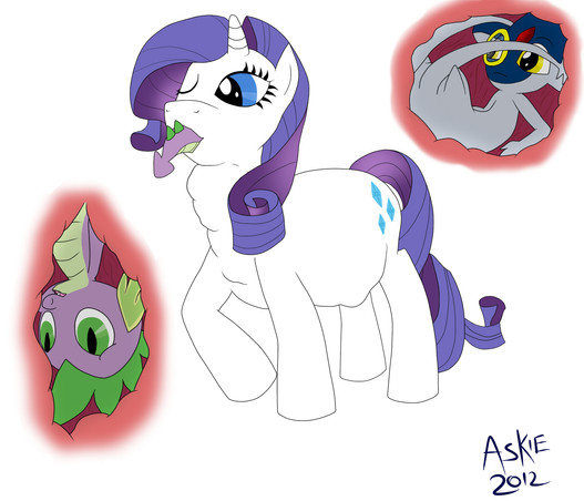 Garble: [Hearing Rarity's voice] "It WAS funny, you crazy pony!! Let me out, Diamond-butt!" [Hits Rarity's stomach walls with his fists...which only tickles the unicorn]
