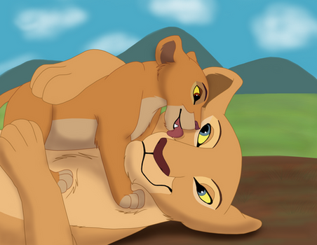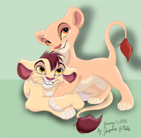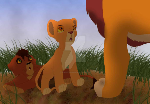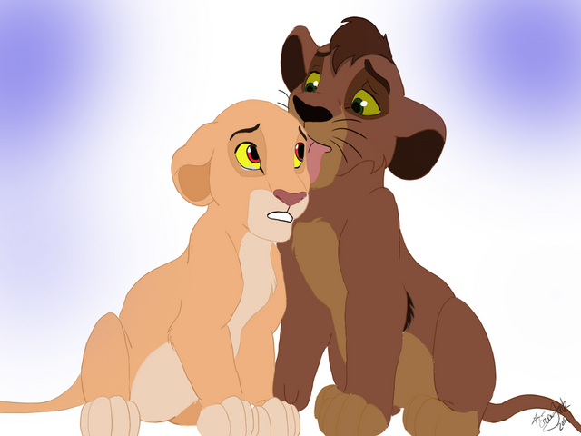 Much to his surprise, the queen had offered Kovu a bath--something he hadn't had in a very long time. Shy at first, the little cub hesitantly accepted; she WAS a pridelander after all. Yet, so was Kiara. And she was nothing like those "evil" lions his mother had described.Absorbed in the rythmic movement of the queen's tongue across his dust-filled fur, he almost didn't notice the golden cub approaching him. "Ah!" Kovu suddenly cried, his cheeks flushing scarlet, "Kiara, what are you doing here?!"