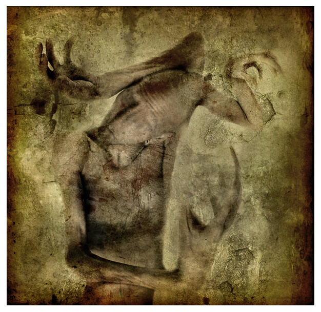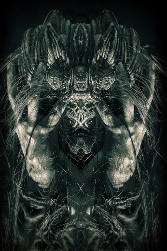 It's like the vase/face picture. One way I see it as a skinny person, ribs over exposed from starvation, another way and it like the ribcage's the whole picture, and it's been ripped opened. Sometimes it's the Virgin Mary, sometimes it's a demon, wings folded behind.