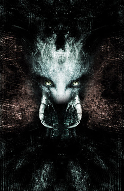 *twists art around and around* lol, uhm. ok i see the head, and i see what looks liek tetth, then i see some more teeth. it looks funky from the side, i liek that lol. but straightwards it reminds me of that weird bat thingy from the golden child. jsut better...and scarier...more of the kind of 'im going to suck your brains out'. i like the textures near the top moreso