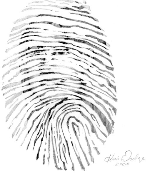 The thumbprint is mine. So are the words. I composed this with a black Crayola marker, my thumb, Adobe Photoshop, Adobe Illustrator, and Quark Xpress.