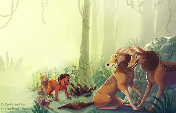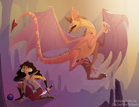 First of all, I really like the composition of this piece and the story it sweeps you into. Β All the characters have an appealing design that balances cute and dangerous very nicely. I especially love the dragon and the protective body language shown for the human character.Β