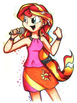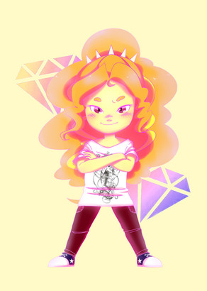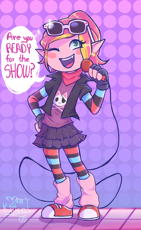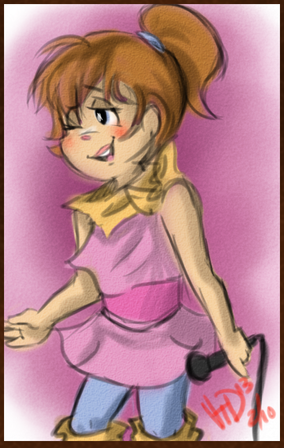Ok so seeing how this was supposed to be a short project that turned into a much longer project I can honestly say it looks amazing especially since her hair is down and some of it is falling into her eye in that typical just don't care way. The shading is absolutely amazing with thoughtfully placed patches of light reflecting of certain areas that makes the character pop. This is extremely hard to do so most artist stick to just shading which means this just took the piece to a whole new level. The changing of her outfit to more of a rock one to go with songs from those groups is really amazing and well thought out. The fish nets on her hands are particularly a very well placed extra that the character normally doesn't wear adding to the effect of the overall piece reminding the onlookers that she's singing but not normal Phineas and Ferb type songs which is an amazing idea as their kids aren't exactly them. Ok personally I do have one thing that is bothering me; the thing bothering me is that the section of hair that's supposed to be brown looks like a mix between violet and brown.