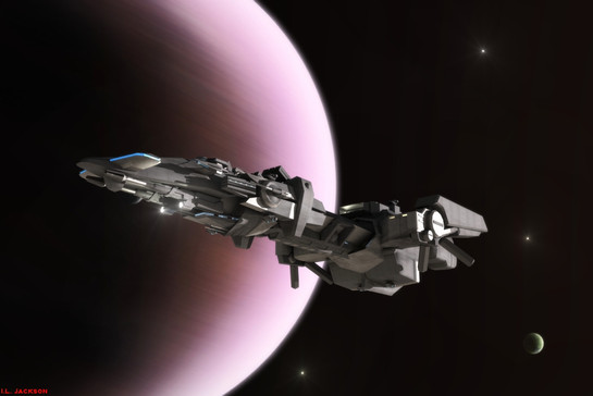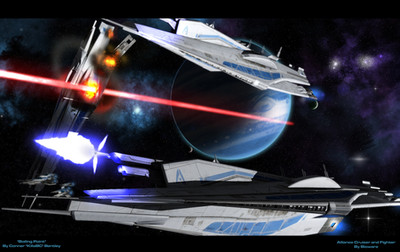 An Alliance Cruiser sits above a planet directing troops to destroy a Cerberus fighter production facility. Its is successful.The Planet is from the Spaceengine heavily modified in photoshop. I wanted something close up and detailed and Terragen is expensive so this seemed like the best alternative.