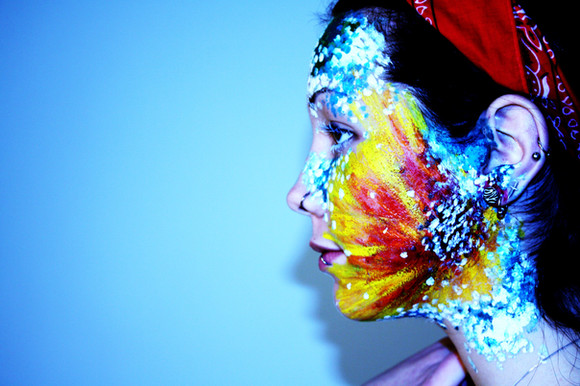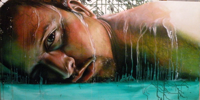 haha.. too much. The painting is very nice. Is it supposed to be one of those carnival things where you put your head through the hole, and people take a photo of you with a strong-man body or something though?? its a funny/strange reference for a serious and dark work. Know what I'm talking about? Damn... what are those things called... ??