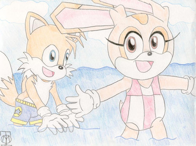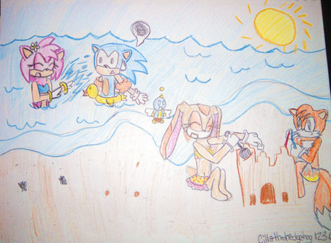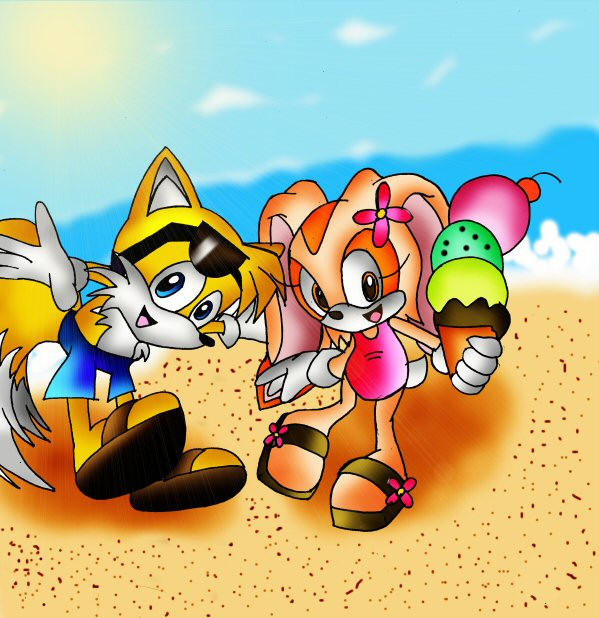 this is my entry of tails and cream at the beach in their rubber rings having fun oh its for the contest because its summer soon we had to put them in a summer themeoh by the way this is my first pic i have used photoshop myself so if its crap thats why