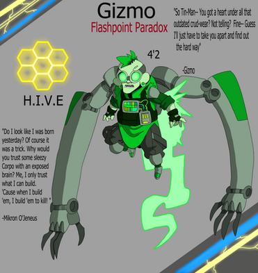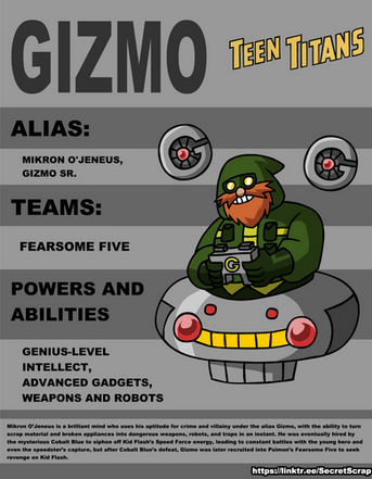 Yeah some edit I did because I was bored... (as usual) so yeah. Gizmo is one of my favorite villain in Teen Titans. And yeah I really have no idea what's his age height and weight is, so sorry about that XD. I'll edit it out once I got some info. I want to make some for the other Hive members as well. so.... guess stay tuned. Hope you guys enjoyed this oneRelated content