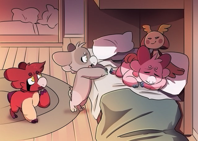 The wyngling's body was heavy, covered in a cold sweat with a cough so weak that there was no chance for her to survive. The best thing to do was make her comfortable and give her a gentle death. She placed the wyngling onto a pillow only to see them reach out with a desperation that screamed to save her. Alma frowned, watching this wyngling suffer was so hard as she grasped their tiny paw within their claw with a soft squeeze.