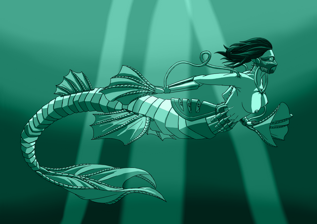 #arm #blue #dark #fin #grey #red #water #sword_for_arm #robot_mermaid #cyborg #cyborggirl #experiment #mermaid #mermaidgirl #readhead #redhair #redhairedgirl #robot #skeleton #sword #tubes #underwater