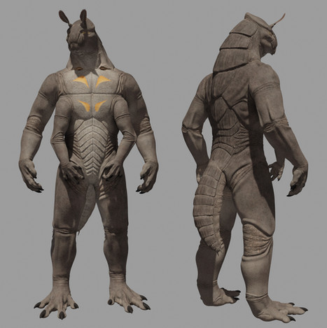 Evolved on the old, rocky world of Iunulo, dominate by its black, desolate, rocky crags, numerous extinct volcanoes and exposed to elevated radiation due to a weak magnetic field, the ripasteeva are fairy bulky bipedal beings with two large upper limbs ending with two large digits and a smaller opposable thumb and two smaller legs that end with three clawed fingers and a third pointing backwards- due to the rocky nature of Iunulo's surface, the ripasteevan' legs are very efficient in traversing the terrain, but its their large arms which allows them to climb even the steepest of cliffs in search of food. Despite the low gravity of Iunulo, the ripasteeva musculature is surprisingly developed. The ripasteevan head is embedded into the upper torso, lacking a neck, and presents four bright yellow eyes, their mouth being little more than a vertical slit which parts to reveal rows of small lamprey-like teeth. A bony crest adorns the top and back of their heads, growing more prominent and colorful in males. Their skin is dark, with various stripped patterns to camouflage in the black rocky terrain.