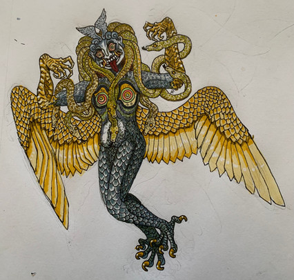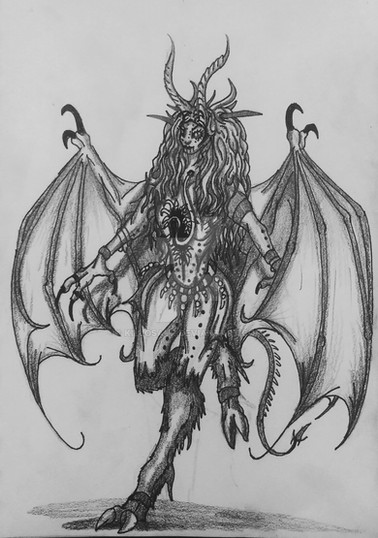 Decided to draw her as more monster-like than human sibce she represents terror and all aspects of darkness and not to mention that she is the mother of monsters.The head, which has two sprouting alien heads and large horns was mainly inspired by H.R Giger's Master and Margarita painting which is also the album art for Danzig's How the Gods Kill album(not my usual taste in music but it is an album from my childhood).The rest of her body was inspired by a mix of different depictions of Lilith along with the Mythical Monster podcast found on spotify.