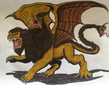 A creature from Greek/ Persian mythology.The manticore is a powerful and dangerous beast that equals that of the chimera.It a face like that of a human with a lion's body and a scorpions tail.It is also portrayed with porcupine quills which can be be shot out from any point of its body,making the beast even more deadly.Its mouth houses three rows of teeth which help to devour its prey whole.The manticore leaves no trace of it victims behind.The name manticore means"man-eater"