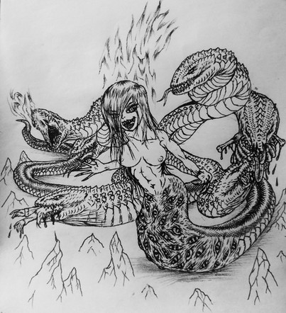 Another one of my drawing that have been done for awhile and has smeared a bit.Luckly it didnt affect the outcome too muchSo depticions have her standing on two legs and some with a snakes' body and tail.I choose the latter version since it makes her seem more monsterous.In my opinion she could have shifted between the two forms in order to fill her needs(like from and calm to an attack state).