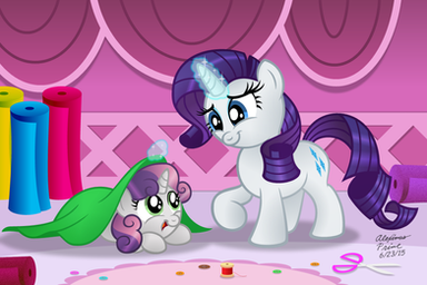 Very adorable piece. It's kinda cute and sisterly how they're fixing each other's hair here. (Apparently Sweetie isn't that experienced yet. Hehe) Very good coloring, and I like your drawing style to.