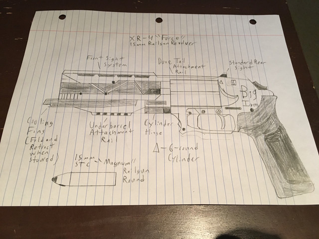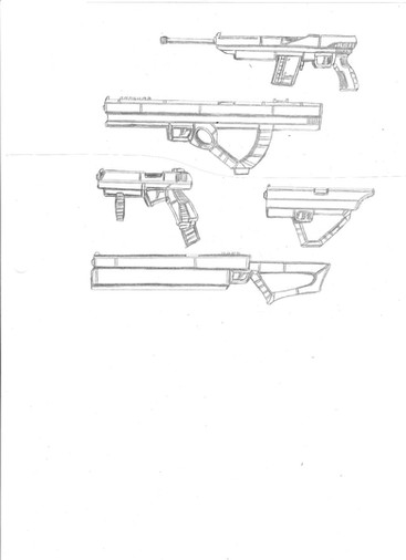 Based on FN Five-seveN and Grand Power K100 X-caliberThis pistol was developed to chamber a small caliber round that is effective at penetrating light body armor with plenty of stopping power. This weapon has a large mag capacity and has minimal recoil for fast follow up shots. The custom Advanced Combat Pistol model comes equip with with a 6" barrel, extended mag, 3 round limited burst trigger, a custom slide mounted mini reflex sight, a custom flash suppressor and the multi-weapon attachment and also uses a special DP round. This weapon attachment uses an energy-mater converter to manipulate the barrel into different forms and replicates a fresh round directly into the chamber. This attachment can be set to fire 15 mm HE mini grenade, 13/15 mm magnum round, 15 mm shotgun, 4.5 mm multi barreled SMG, Continuous fire high intensity cutting laser and short range arc taser with others in development.