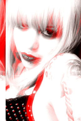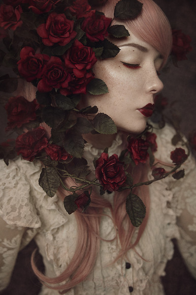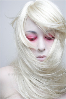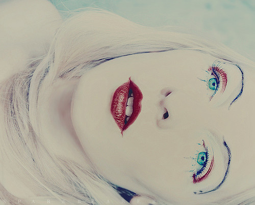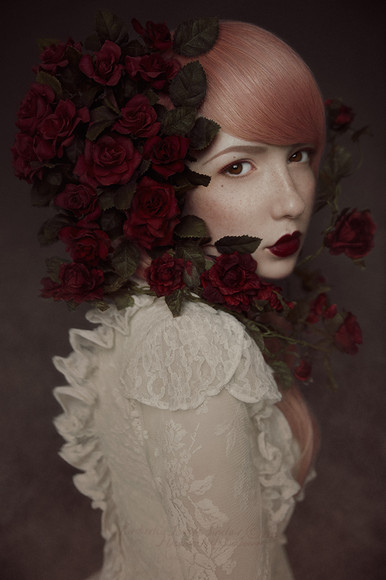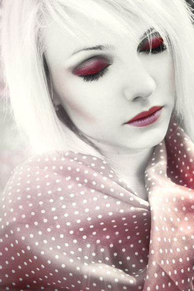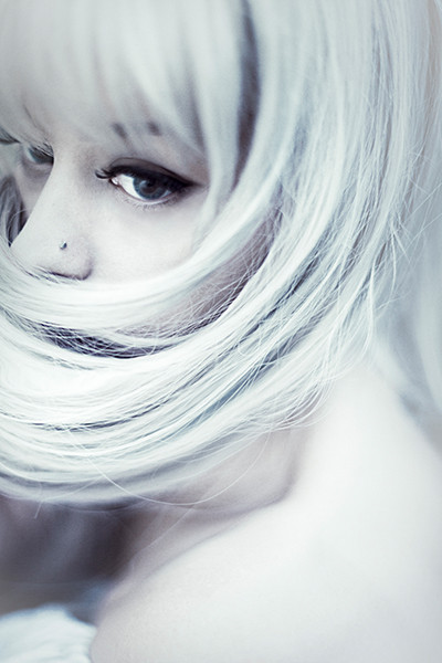 I love the how the red lipstick contrasts with the white face and hair. You look absolutely exquisite. Beautiful photography.