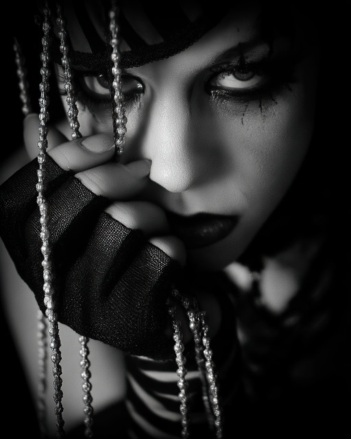 #black #contrast #creepy #eye #fringe #hair #hand #nails #pose #red #sharp #stare #white