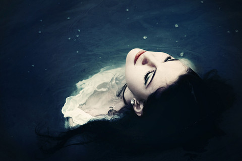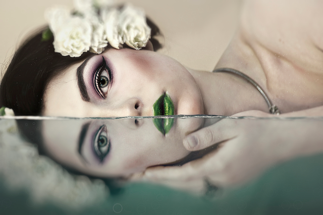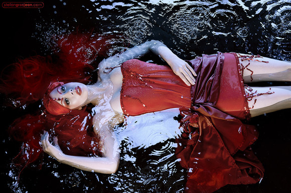 #black #dress #eyelashes #freckles #hair #lace #leaves #makeup #red #rose #roses #underwater #water