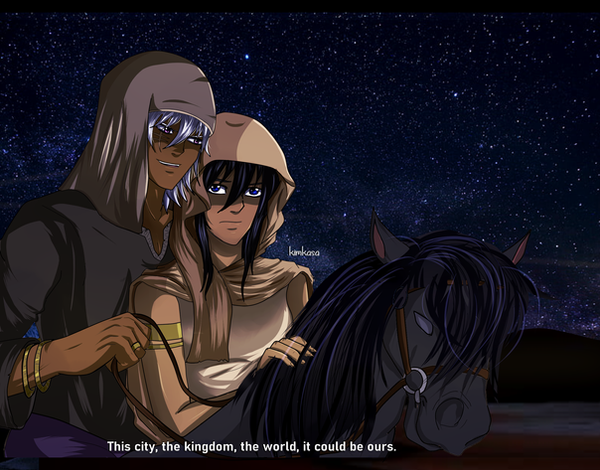 Upcoming scene for my "original" arc in my story. In this arc, Ryou, Bakura, and Kim are stuck in an alternate universe where Yami Marik is pharaoh.