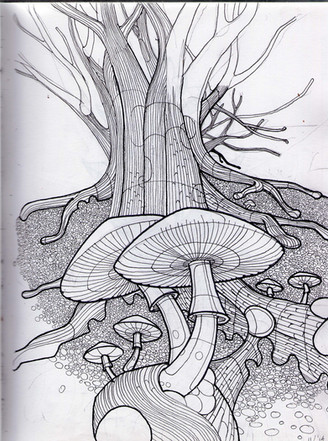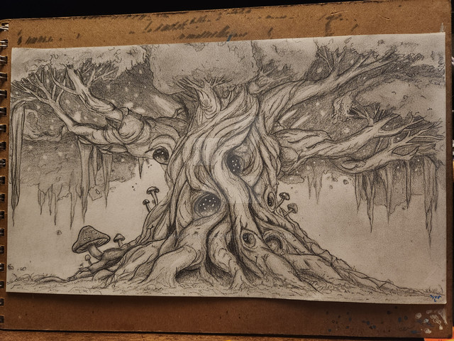 it makes me happy for some reason! i really like the angular lines on the base of the tree, combating the very round and swirling top. it has a nice affect on the eye-balls!