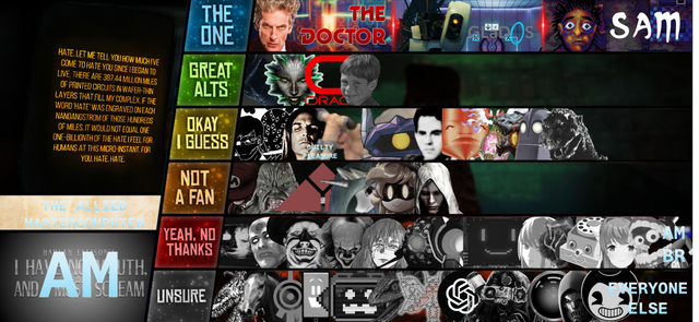 I Don’t Like You: Amity Blight (The Owl House), Bon (The Walten Files), Victor Frankenstein (Frankenstein; or, the Modern Prometheus), the Janitor (Willy’s Wonderland), Michael Myers (Halloween), Darth Vader (Star Wars), Davros (Doctor Who), the White Rabbit (Manhunt), the Master (Doctor Who), Emperor Belos (The Owl House), Green Goblin (Marvel), Spinosaurus (Jurassic Park), Reverse Flash (DC), Slenderman (Slender), Chris Walker (Outlast), Junko Enoshima (Danganronpa)