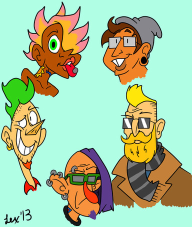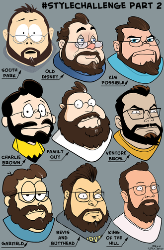 I saw this going around on the Twitters and thought I'd give it a go. I thought I'd be terrible at it but it turned out not so bad? I actually think my own style is the one that's come off the worst. (Except maybe the KND one. I wasn't sure whether to put the beard on that, and also I'm not super happy with the line work.)BONUS ROUND: Guess which of these shows I have never seen or heard of