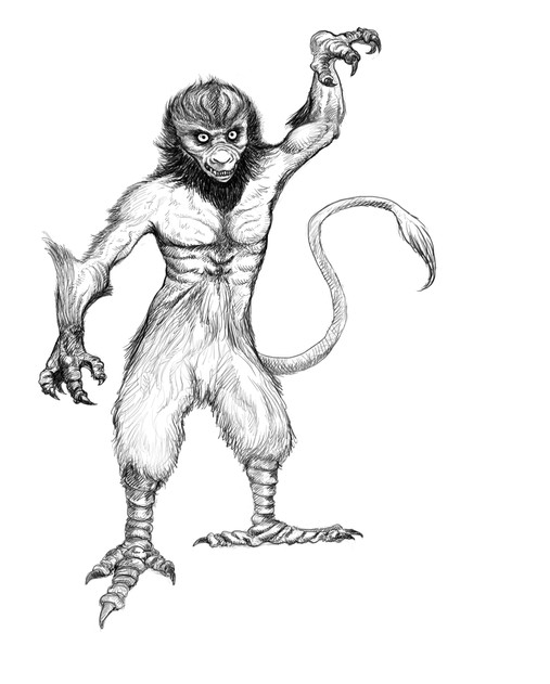 "Somewhere in these primitive forests were the ruins of an ancient, accursed city, men whispered, and among its tombs slunk gray, anthropomorphic shadows--Conan shuddered strongly. He lay staring at the malformed head that rose dimly above him, and cautiously he extended a hand toward the sword at his hip. With a horrible cry that the man involuntarily echoed, the monster was at his throat. Conan threw up his right arm, and the doglike jaws closed on it, driving the mail links into the hard flesh. The misshapen yet manlike hands clutched for his throat, but he evaded them with a heave and roll of his whole body, at the same time drawing his dagger with his left hand."