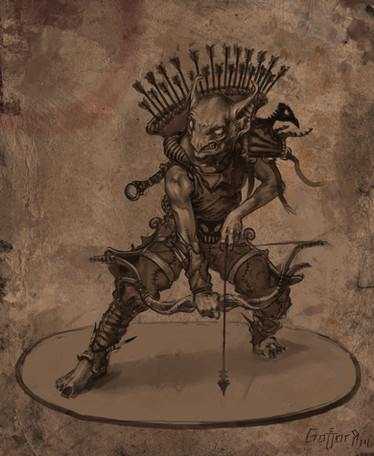 A goblin. This one doesn't dance a magic dance though.I always pictured Goblins using pole weapons. Why? Well think about it, a goblinΒ is much shorter than a human. Using a short weapon, like a sword, mace, axe, etc it would have problems reaching his opponent at all, not to mention wounding him fatally. From his perspective, it would probably feel like for regular size human to fight a mounted opponent. Therefore, a long spear. Notice how the spearhead has been forged in order to resemble goblins head, with a pointy nose and two ears. the goblin has also an extremely keen sense of hearing and smell, due to those overgrown organs.Β