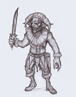 "The Trickster Champion, favored by Kaos and God of Luck; disciple of the latter. With a sardonic smile he stumbles across the worlds crafting his Laughter into the most unstoppable weapon of all; The laughter literally becomes the blades that sever strings of Reality itself. His weapons, which all resemble wicked grins in form cut through any substance, shield, protection, magick - provided that the wielders will is strong and unbroken. They are also known to emit insane cackling as they slash through living flesh; Their offensive use doubles as a versatile defense, capable of nullifying any incoming attack ("Nothin' can't hurt ya if it ain't real")Taught contempt of both Time and Space by the Fishers when he resided beyond the Multiverse, he, however, abandoned their hermit-like lifestyle instead followingΒ where more action is. Nevertheless he is not interested in interacting with the surrounding world most of the time, thus he had severed HIMSELF from the world giving him the unlimited freedom to stumble aimlessly for all eternity. He can reattach himself to reality - by what means unknown. What is known - if you hear the bells, you are doomed."