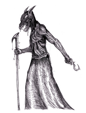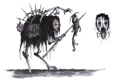 Bah, everyone keeps saying "this looks like such-and-such," but the creature and art style are perfectly unique in themselves. At best it has some resemblance to Wayne Barlowe's especially creepy demon art, but even then it stands out as a very striking, very bizarre christmas tree of hunting tools and the fragility of life. I can see this thing lurking in the shadows of the minds of all wild men, such as Conan's Picts. Hell, this could very well be a child of Jhebbal Sag, if not Jhebbal Sag himself!
