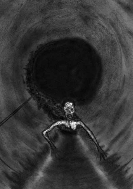 "Oh yes, far, far down there was a movement, and the movement was upwards—towards the surface. Nearer and nearer it came, and it was of a blackish-grey colour with more than one dark hole. It took shape as a face—a human face—a burnt human face: and with the odious writhings of a wasp creeping out of a rotten apple there clambered forth an appearance of a form, waving black arms prepared to clasp the head that was bending over them. With a convulsion of despair Humphreys threw himself back, struck his head against a hanging lamp, and fell."M. R. James, Mr Humphreys and His Inheritance