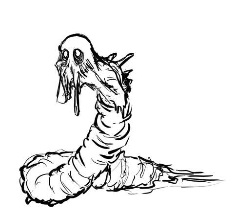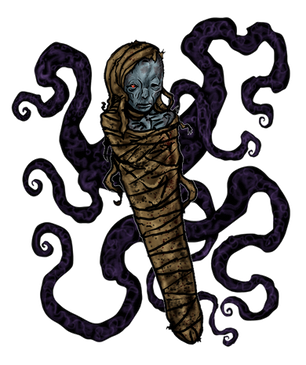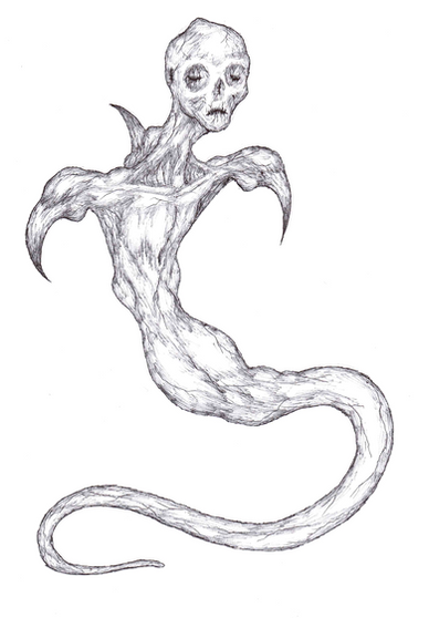 Vengeful ghost of a religious fanatic... There are many excellent portrayals so in order to be a bit original I gave her maggot-like form."(...)I see what looked to be like a great roll of old shabby white flannel, about four to five feet high, fall for'ards out of the inside of the safe right against Mr. Potwitch's shoulder as he was stooping over; and Mr. Potwitch, he raised himself up as it were, resting his hands on the package, and gave a exclamation. And I can't hardly expect you should take what I says, but as true as I stand here I see this roll had a kind of a face in the upper end of it, sir. You can't be more surprised than what I was, I can assure you, and I've seen a lot in me time. Yes, I can describe it if you wish it, sir; it was very much the same as this wall here in colour [the wall had an earth-coloured distemper] and it had a bit of a band tied round underneath. And the eyes, well they was dry-like, and much as if there was two big spiders' bodies in the holes. Hair? no, I don't know as there was much hair to be seen; the flannel-stuff was over the top of the 'ead. I'm very sure it warn't what it should have been. No, I only see it in a flash, but I took it in like a photograft—wish I hadn't. Yes, sir, it fell right over on to Mr. Potwitch's shoulder, and this face hid in his neck,—yes, sir, about where the injury was,—more like a ferret going for a rabbit than anythink else; and he rolled over, and of course I tried to get in at the door; but as you know, sir, it were locked on the inside, and all I could do, I rung up everyone, and the surgeon come, and the police and you gentlemen, and you know as much as what I do. If you won't be requirin' me any more to-day I'd be glad to be getting off home; it's shook me up more than I thought for."