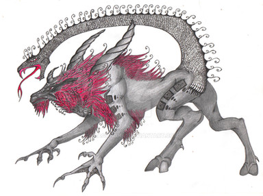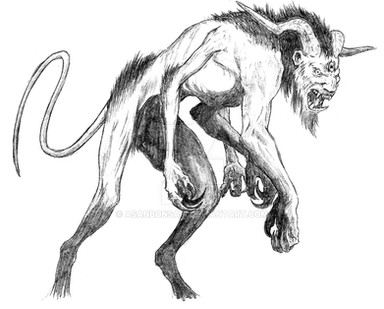 A creature that ancient Greeks believed to live somewhere in India. It was supposed to be a lion with scorpion like tail and man's face. 9a bit similar to Geryon from Divine comedy..) And it could fire spikes from the tail. In case of my interpretation the small quills along the tail are responsible for that. Being loosely attached, they can bi fired inrandom directions when creature swings it's tail in defense.Related content