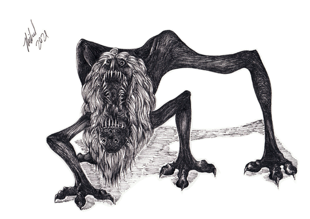 Normally he's a Frankenstein type creature with human features and qualities. He's very calm and quite gentle, however, he becomes an enraged beast when he feels his life is threatened, this monster being an amalgamation of the twisted imagination spawned from the "borrowed" brain in his head. A bestial pair of eyes appears under his human eyes, and his face grows into a crocodilian snout with enormous teeth. His phalanges extend ripping his fingers and turning into razor-sharp claws. The stitches are pulled by masses of black writhing tendrils inside. In his most advanced transformation, his entire legs disintegrate into writhing masses of black tentacles.Β