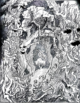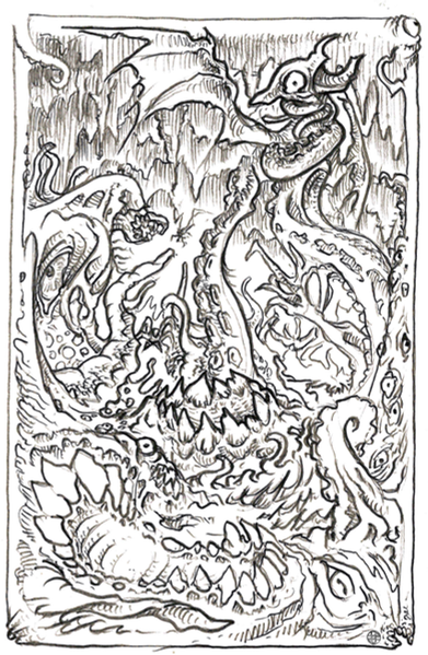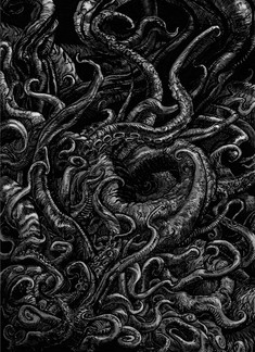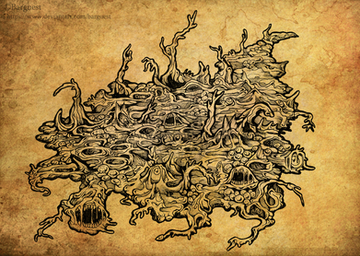 "(...)a sort of pool with a margin of mud that was marled with obscene offal; and in the pool a grayish, horrid mass that nearly choked it from rim to rim... Here, it seemed, was the ultimate source of all miscreation and abomination. For the gray mass quobbed and quivered, and swelled perpetually; and from it, in manifold fission, were spawned the anatomies that crept away on every side through the grotto. There were things like bodiless legs or arms that flailed in the slime, or heads that rolled, or floundering bellies with fishes' fins; and all manner of things malformed and monstrous, that grew in size as they departed from the neighborhood of Abhoth. And those that swam not swiftly ashore when they fell into the pool from Abhoth, were devoured by mouths that gaped in the parent bulk."