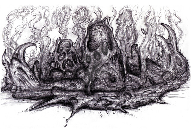 Goddamn, I'm surprised there isn't any flood of comments here. This seems to be your first real illustration of a story, complete with setting, and it looks fantastic! Abhoth is very difficult to get wrong, but as with most things, it looks more natural in your style. It's like you drew the flesh-pool from which all your monster designs are born.