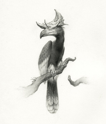 AΒ monstrous and gigantic bird which despises humankind's behavior yet duplicates it.The perch was supported between posts of black jasper flecked as if with blood, and upon it there sat a most gigantic and uncommon bird, eyeing Euvoran with a grim and dreadful and austere mien, as an emperor might eye the gutter-scum that his guards have haled before him for some obscene offense. The plumage of the bird was Tyrian purple, and his beak was like a mighty pick-ax of pale bronze that darkened greenly toward the point, and he clutched the perch with iron talons that were longer than the mailed fingers of a warrior. His head was adorned with quills of turquoise blue and amber yellow, like many a pointed crown; and about his long, unfeathered throat, rough as the scaled skin of a dragon, he wore a singular necklace composed of human heads, and the heads of various ferine beasts such as the weasel, the wildcat, the stoat and the fox, all of which had been reduced to a common size and were no larger than groundnuts.