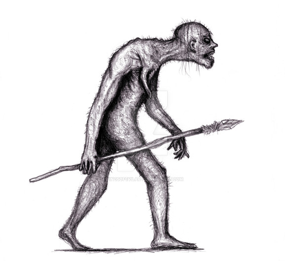Voormis are a race of primitive, cavemen said to be hybrids of humans and soe sort of Great Old Ones. They look pretty much like ape-men but are described with three toed feet ( also gave them three-fingered, reptilian hands for consistency )