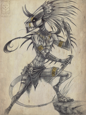 #aztec #creature #deity #dog #feathers #god #hybrid #lovecraftian #monster #ornaments #tentacles #warrior #xolotl