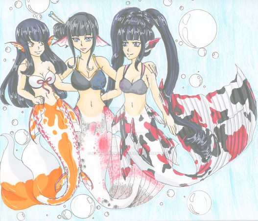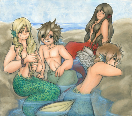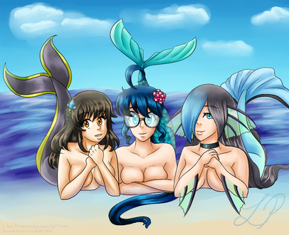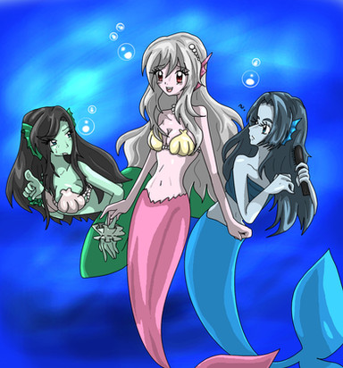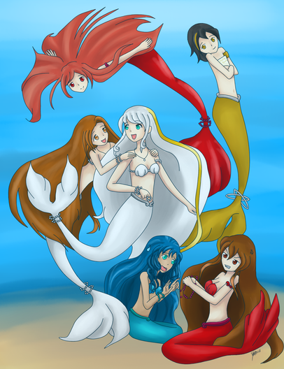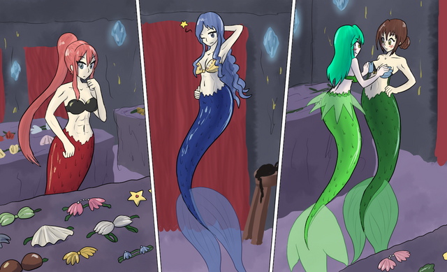 Commission done for ~MercenaryX . Now that Rhea is a mermaid she decides to go on a shopping trip with her mother and Lucky. Kyra is adjusting Rheas' breast, much to her surprise, as she asks Lucky and the sales mermaid Gigi if they think the top she's wearing looks good. Lucky is highly embarrassed and tries to look away but it's too late. He's already gotten an eyeful. Gigi is super excited to be helping Rhea find new tops and holds out one she thinks would look good on the young mermaid.Rhea and Lucky are characters from my comic Moon Reflected in Water [link] while Kyra and a younger version of Lucky can be found in Tsubomi Blue Dreams [link] . Gigi is a side character from my Lunar Lotus Festival Dating Sim [link]