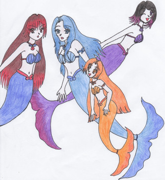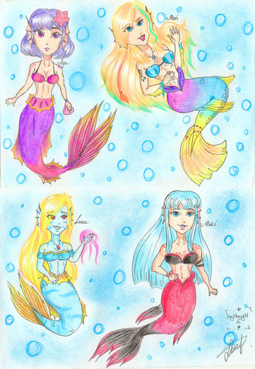 This from a sketch that i did earlier this week and decided to color today. It's been a while since i've drew a mermaid so it's nice to get back in the swing of things. Their designs are based loosely on sharks, koi fish, seaweed, and goldfish. Just randomly piced out things water related. ^^Related content