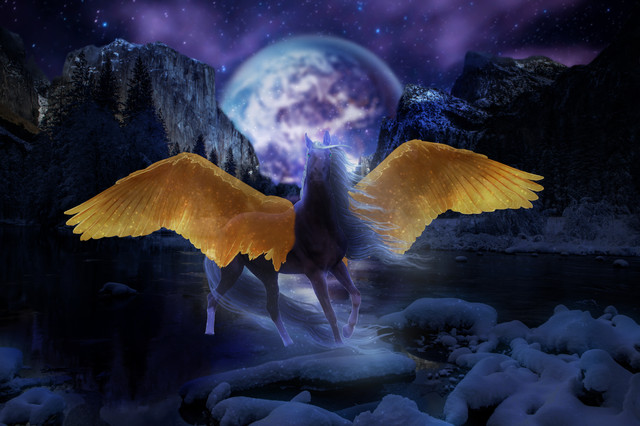 #forest #creature #horse #digitalart #pegasus #dark #equine #glow #gold #photomanipulation #reflection #valkyrie