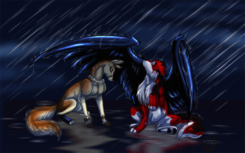 He looks like one've those Mythical creatures from the greeks, but with much more magic toned onto it. Love the rain effect, and shading~~