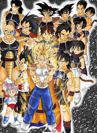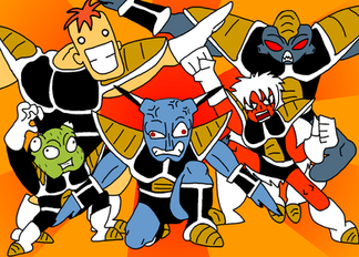 I tried to make all of the special effects on the Ki techniques different as well. Goku's Kamehameha I stuck with the traditional blue beam-look, Gohan's Flying Nimbus/Kinto'n I think stayed pretty true to its original look, Krillin/Kuririn's Kienzan I tried to give a nice swirl to, Yamcha's just doing his Wolf Fang Fist, Tienshinhan's got the Kikoho which I gave a green "laser"-esque quality to and Chaotzu's using an itty-bitty Dodompa. The old "gang" in the Capsule Corp. ship were a little tricky, but I like how they turned out. The Saiyan duo I'm not totally happy with, but making Vegeta (as well as Goku) very animalistic with their screaming was pretty fun.