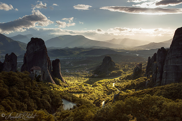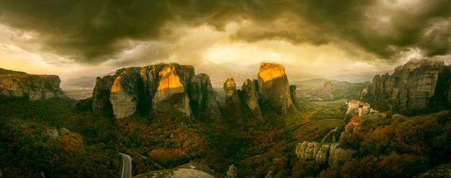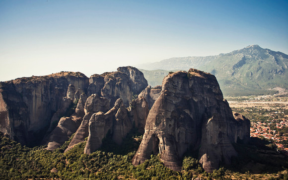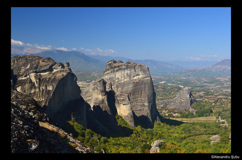 "The Metéora (Greek: Μετέωρα, "suspended rocks", "suspended in the air" or "in the heavens above") is one of the largest and most important complexes of Eastern Orthodox monasteries in Greece, second only to Mount Athos. The six monasteries are built on natural sandstone rock pillars, at the northwestern edge of the Plain of Thessaly near the Pineios river and Pindus Mountains, in central Greece." ~ from wiki