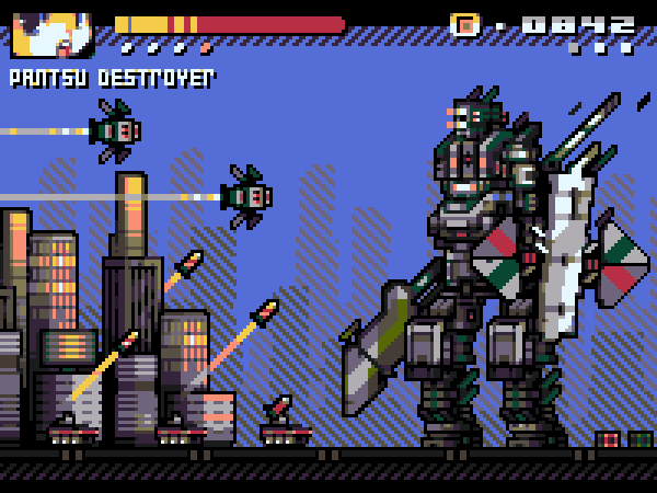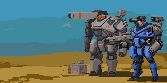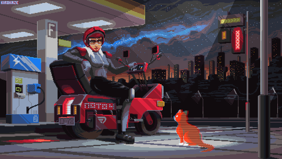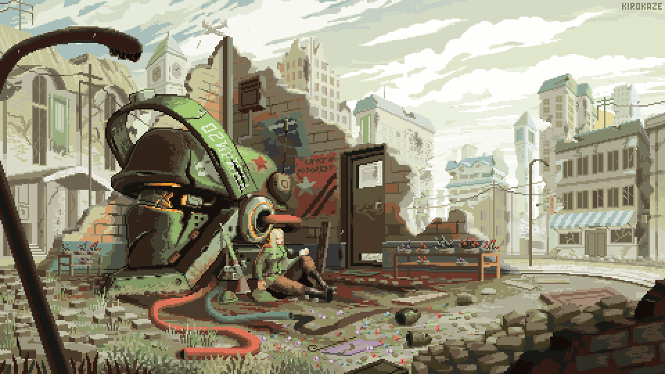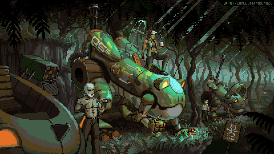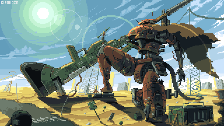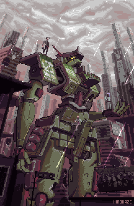 Oooh, I love the red against the greens. Not sure how I feel about the dithering on the mechs legs personally, but it doesn't take away from the picture as a whole. Love her cute head gear.