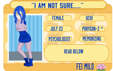 Personality: Elise is mainly soft-spoken and kind. Most of the time she comes off as a very shy and frail pokemon, but in reality she's quite strong, and thoughtful. She just....doesn't like being a leader or doing anything that will bring any unnecessary attention to her, unless it's needed. With her teammate Demetri she sometimes has to keep an eye on him with how unorganized or forgetful he can be at times. She's actually developed a crush on him since the first day they met, but still hasn't said anything over the years. She tries to give little hints about it, but to her dismay his obliviousness to feelings makes it so he doesn't notice. She also has a hard time talking with him because of his lack of engagement in conversation.